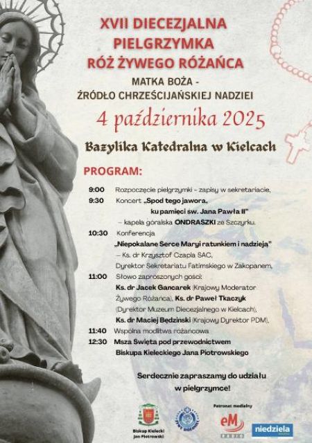 XVII DIECEZJALNA PIELGRZYMKA RÓŻ ŻYWEGO RÓŻAŃCA Bazylika Katedralna w Kielcach 4 października 2025 r. „MATKA BOŻA ŹRÓDŁO CHRZŚCIJAŃSKIEJ NADZIEI”